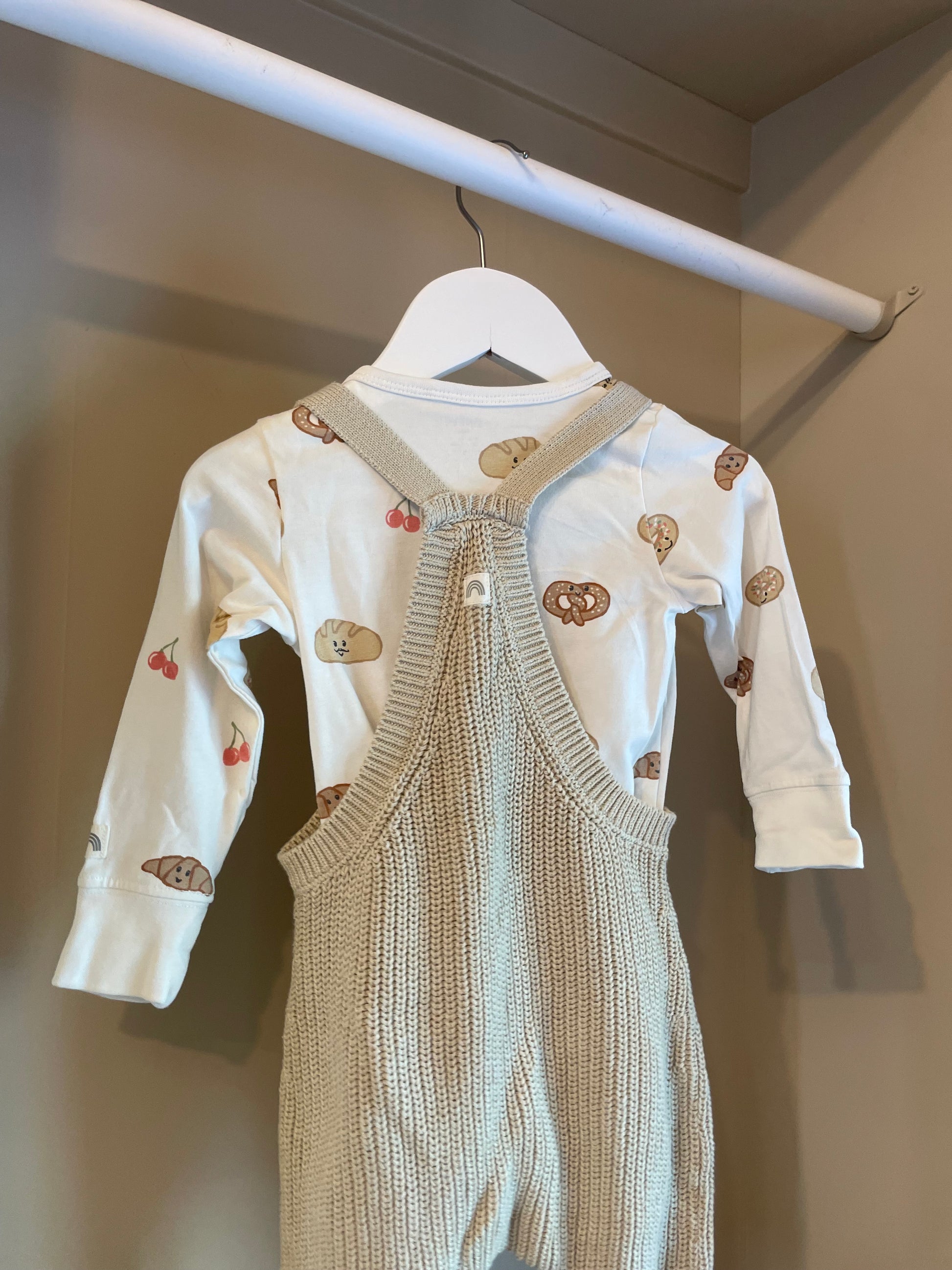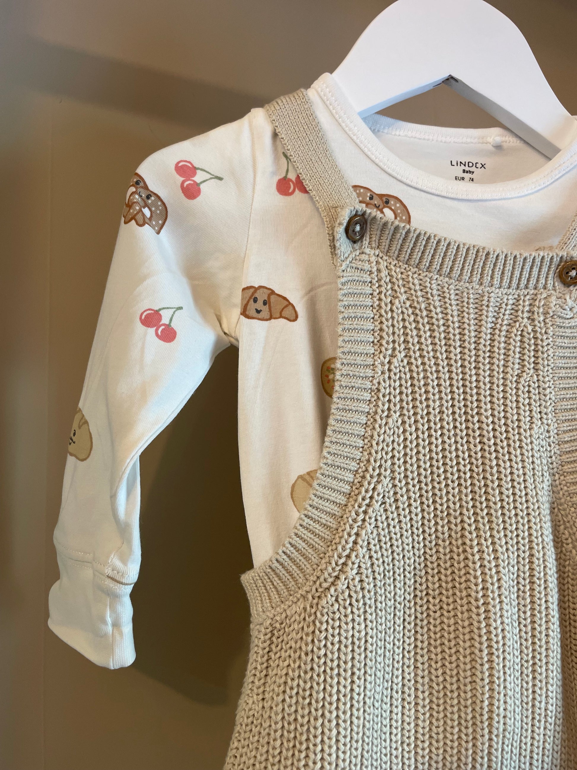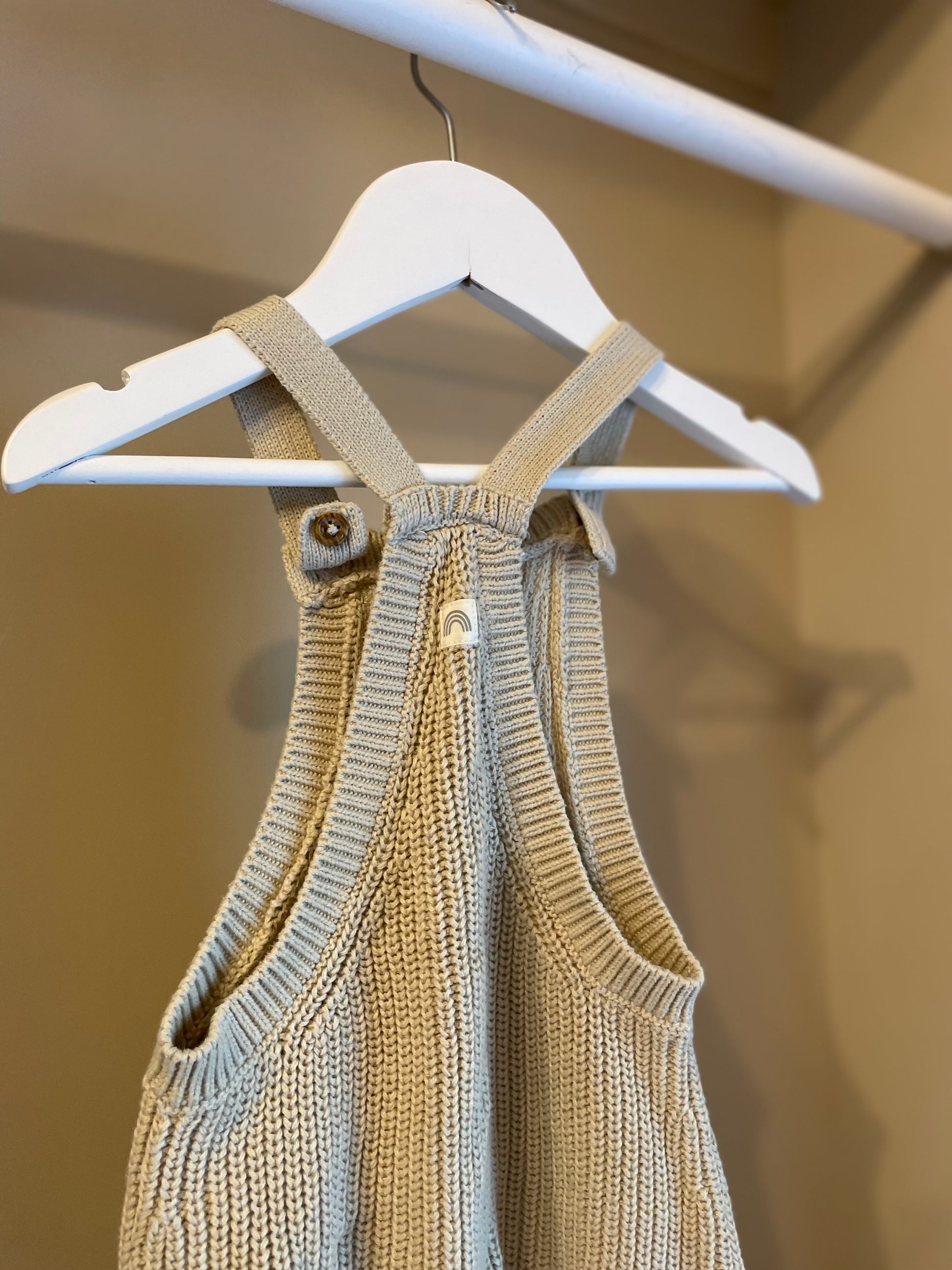 Mjuka stickade hängselbyxor i en varm beige ton. Den tidlösa designen och rymliga passformen gör dem både bekväma och stilfulla – perfekta att växa i och använda länge. En mysig men elegant bas i barnets garderob.