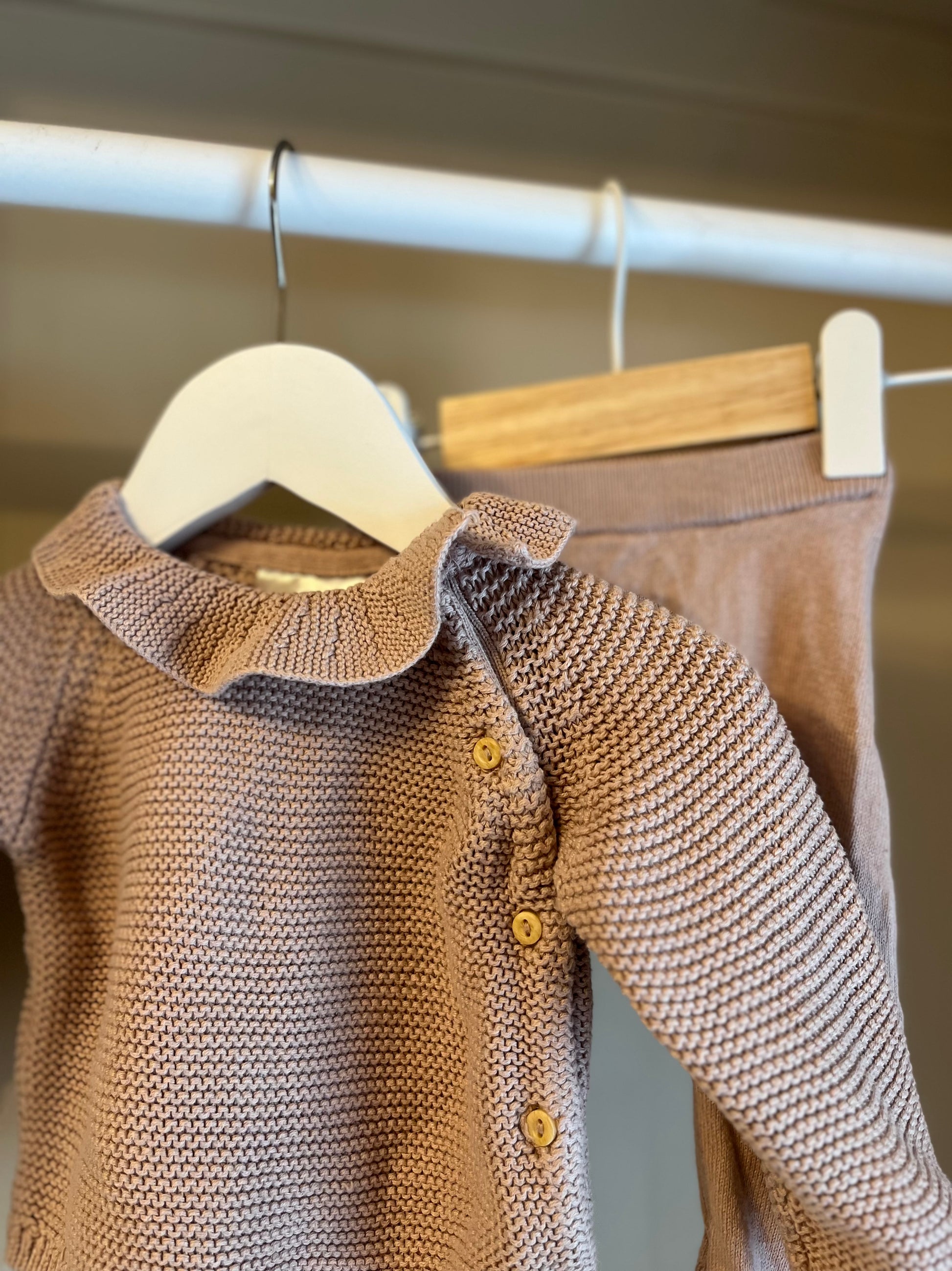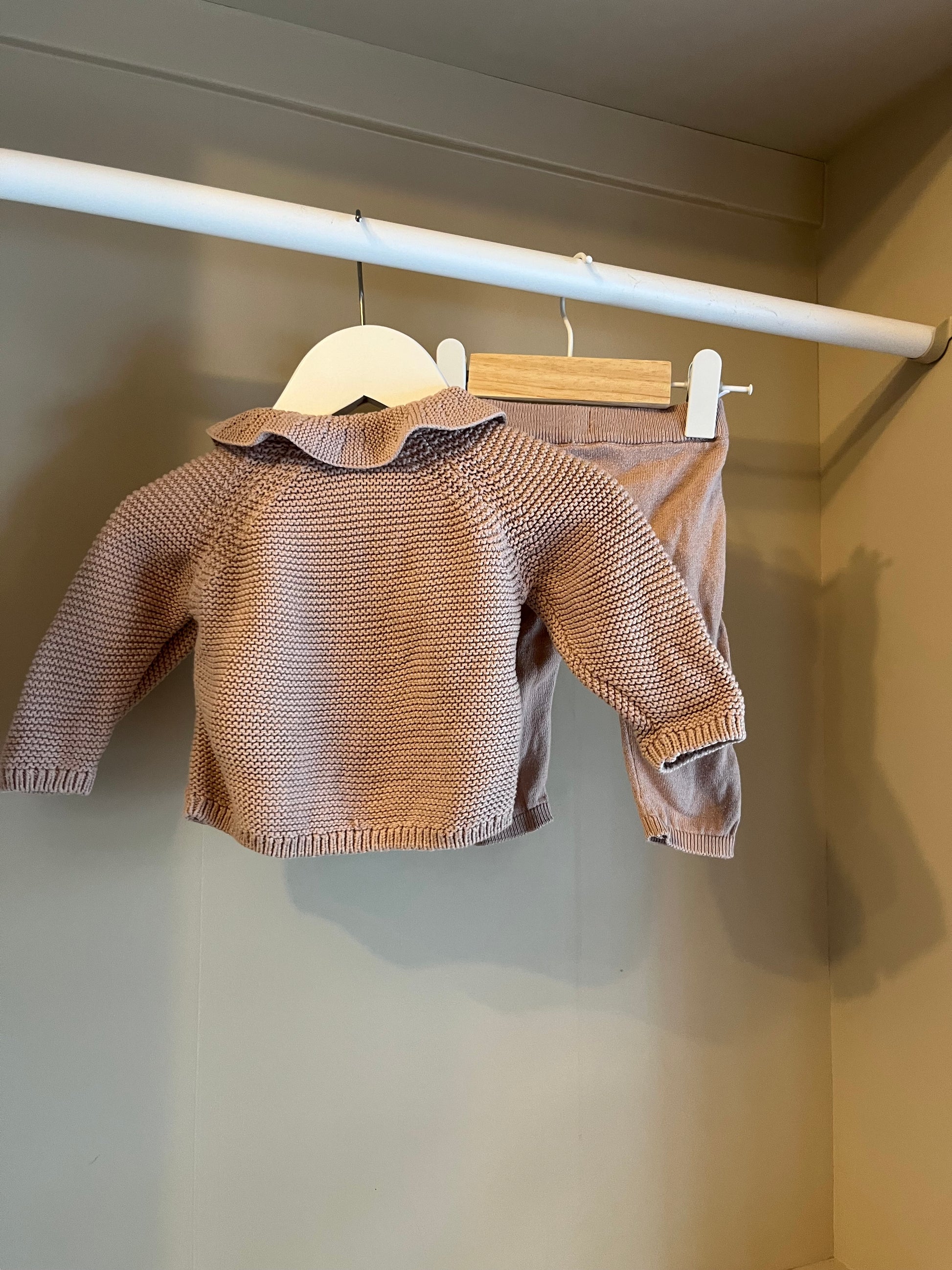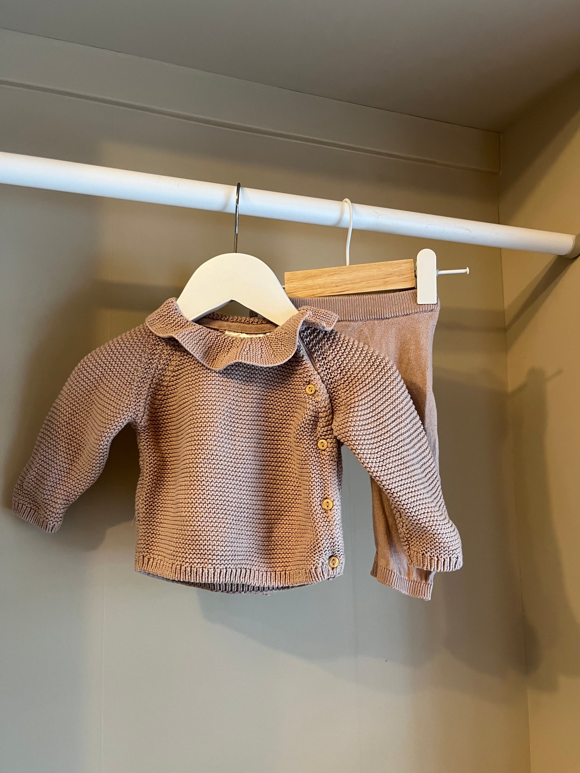 Otroligt gulligt stickat set i mjuk bomull, i en fin gammelrosa nyans. Setet består av stickad tröja med krage och matchande byxor – perfekt för både vardag och finare tillfällen. Materialet är mjukt och följsamt, skonsamt mot barnets hud.