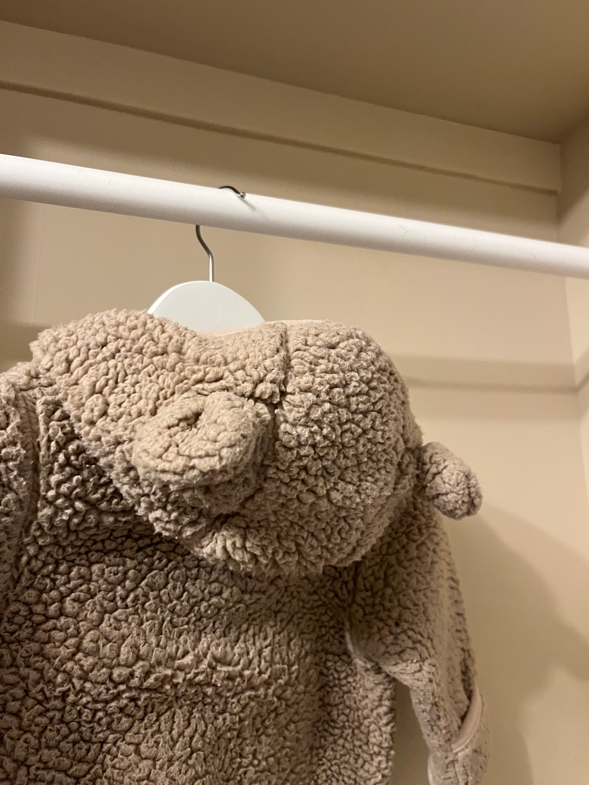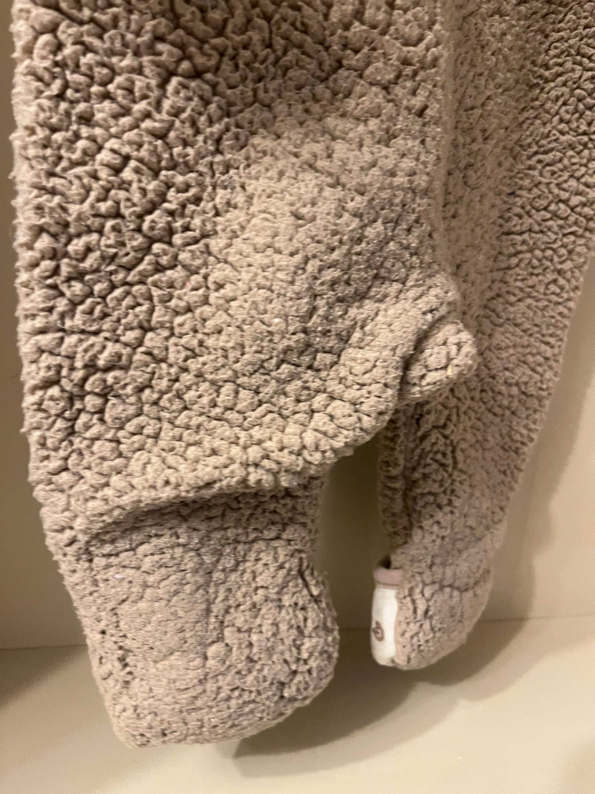 Mysig teddyoverall i mjuk beige ton – perfekt för kyligare dagar. Overallen har huva, hel dragkedja framtill för enkel på- och avklädning samt uppvikbara ärm- och benslut som håller små händer och fötter varma. Fodrad med krämvitt tyg som ger en extra ombonad känsla.