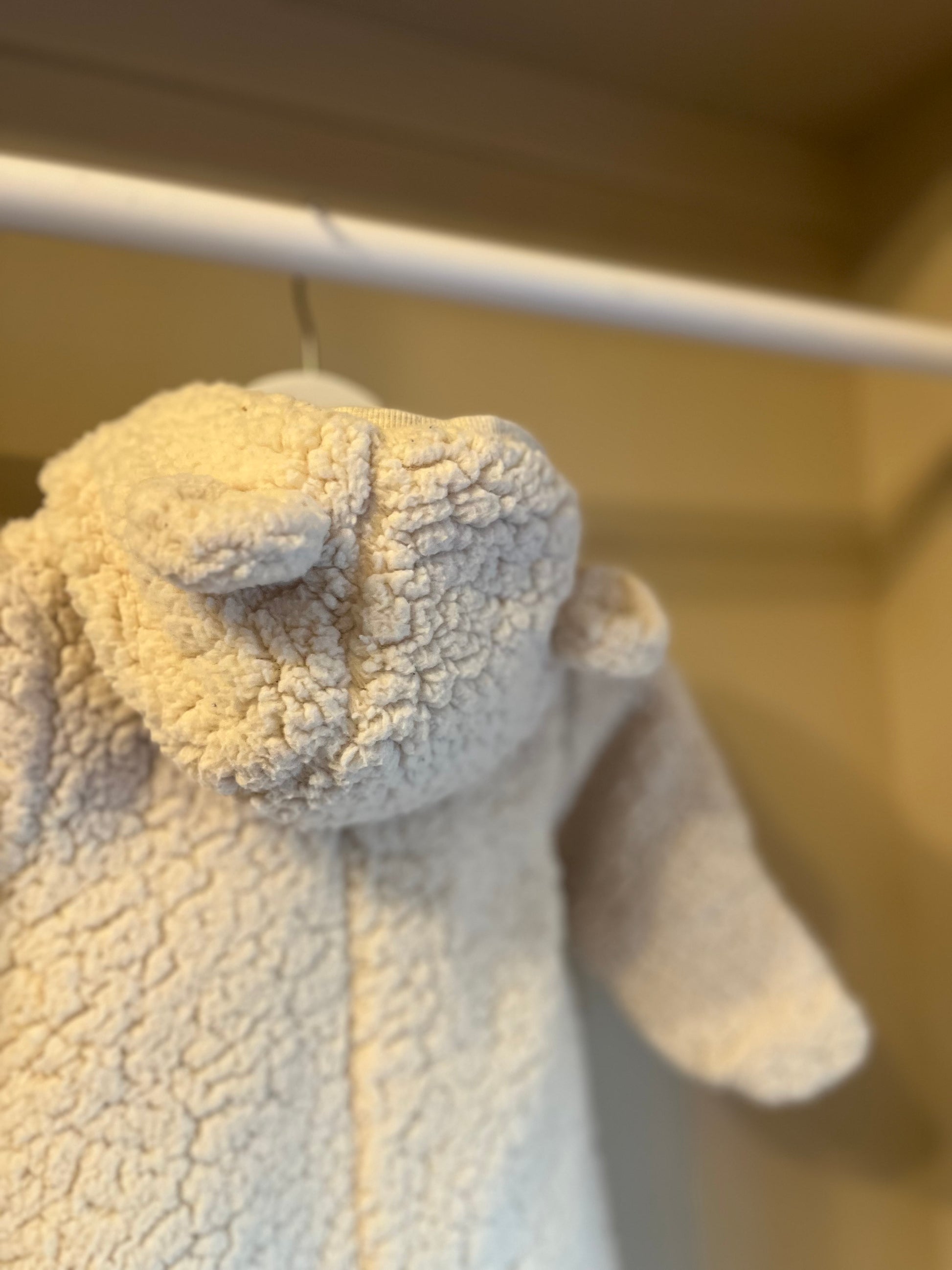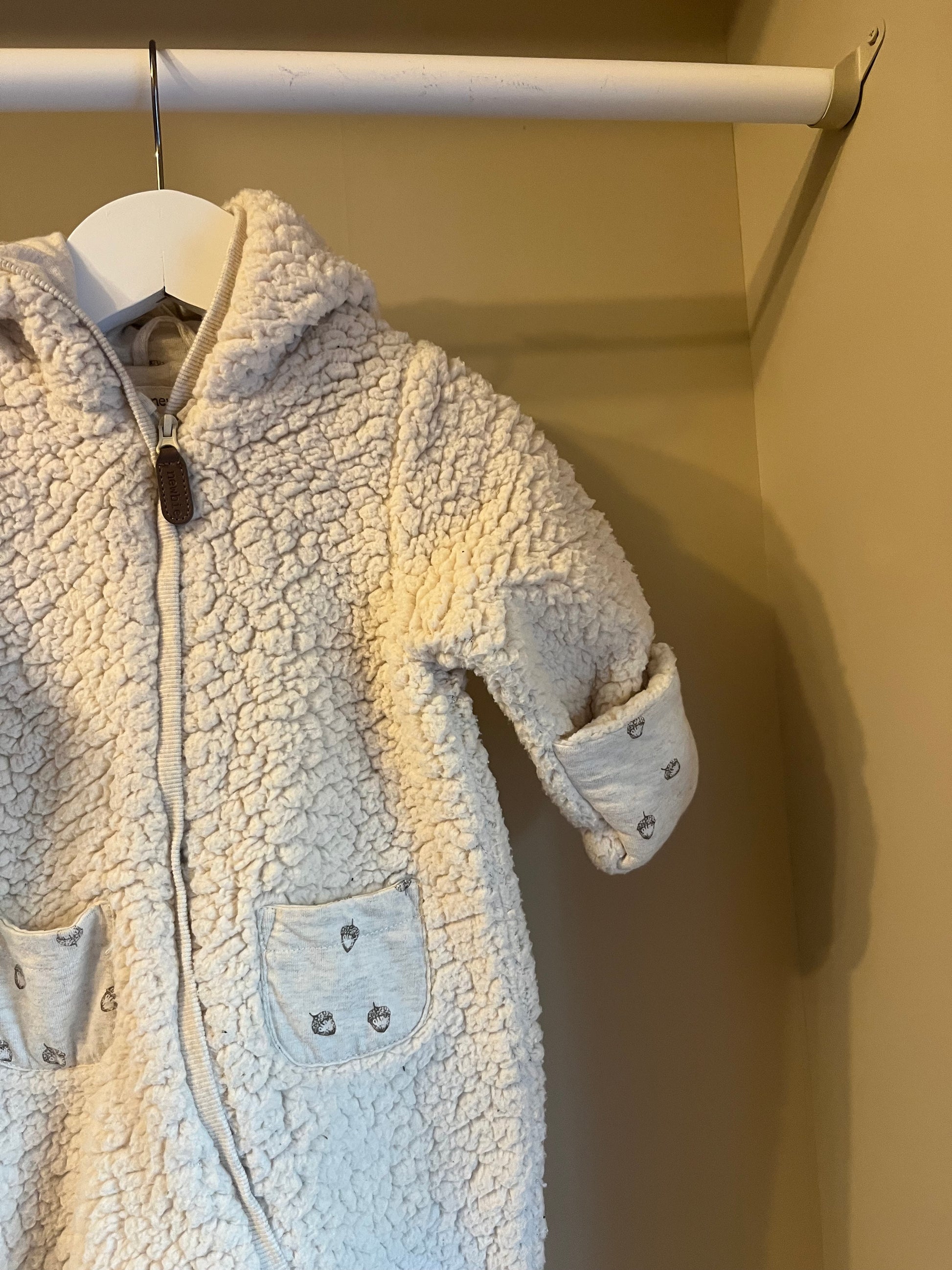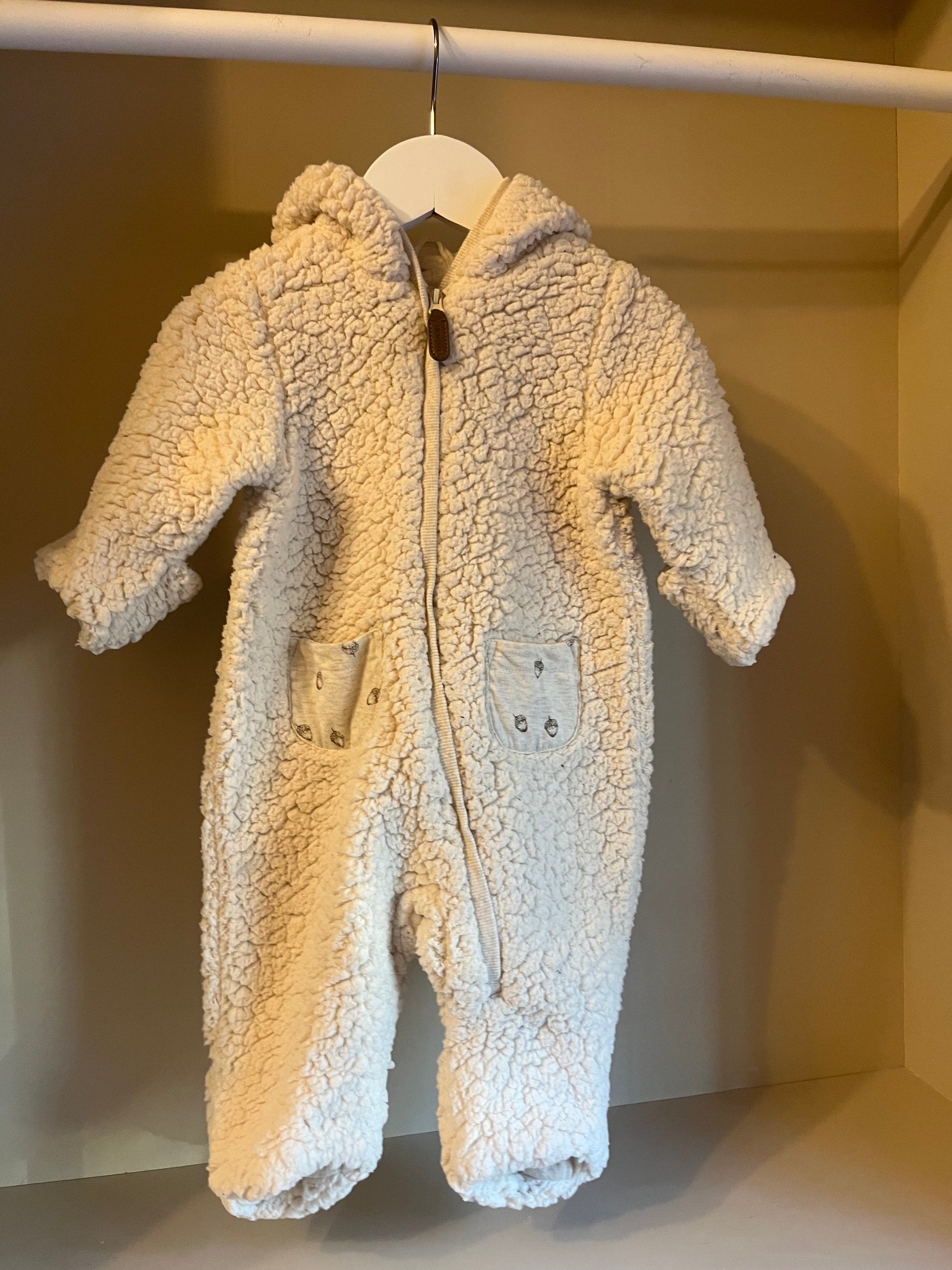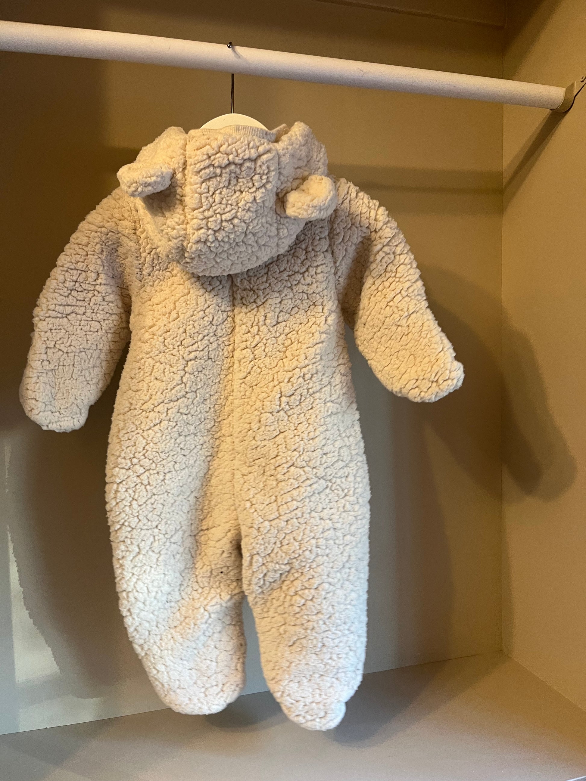 Mysig teddyoverall i mjuk krämvit ton – perfekt för kyligare dagar. Overallen har huva, hel dragkedja framtill för enkel på- och avklädning samt uppvikbara ärm- och benslut som håller små händer och fötter varma. Fodrad med gulligt björntyg som ger en extra ombonad känsla. Tillverkad i återvunnen polyester med 100 % bomull i fodret.