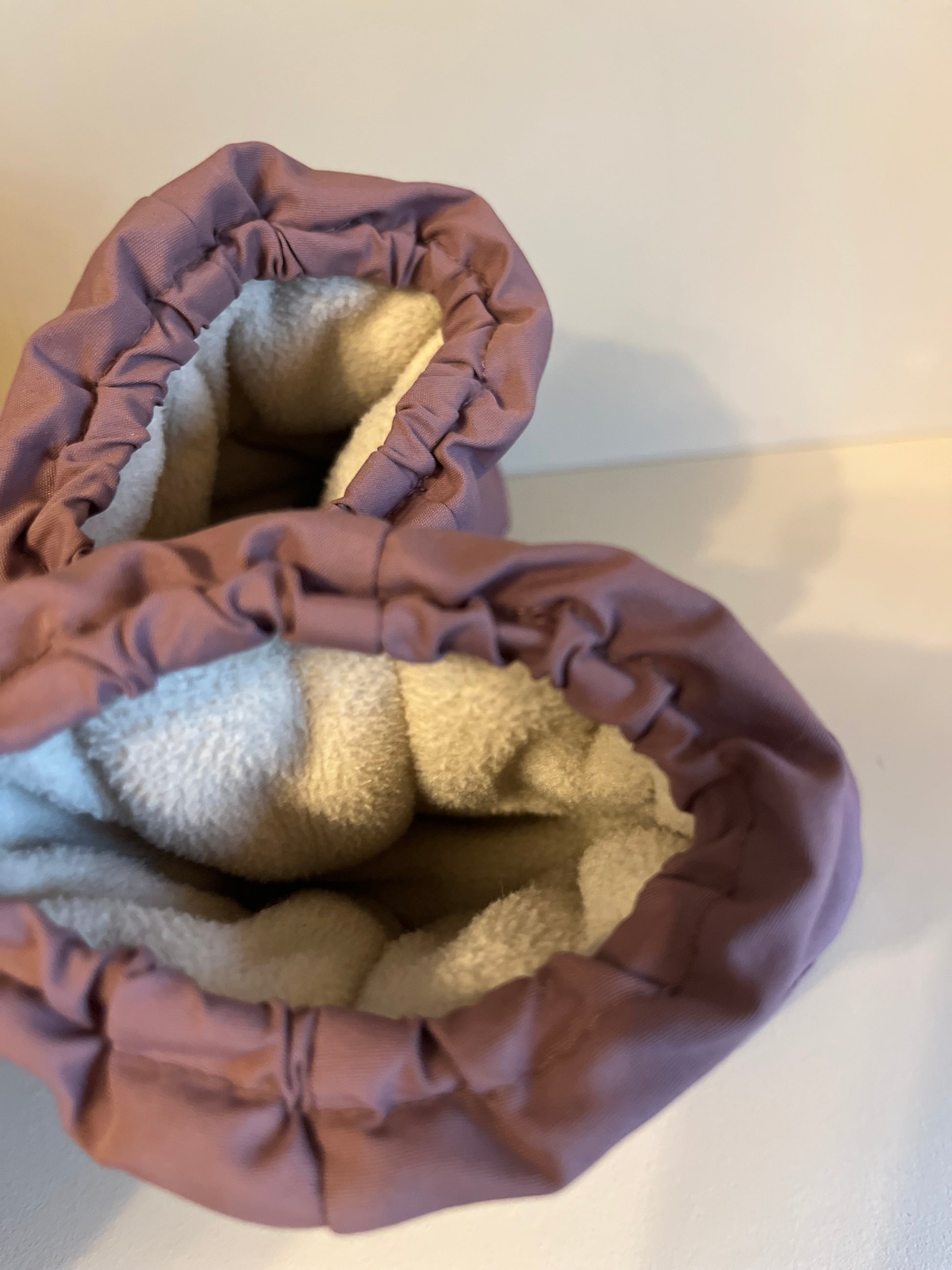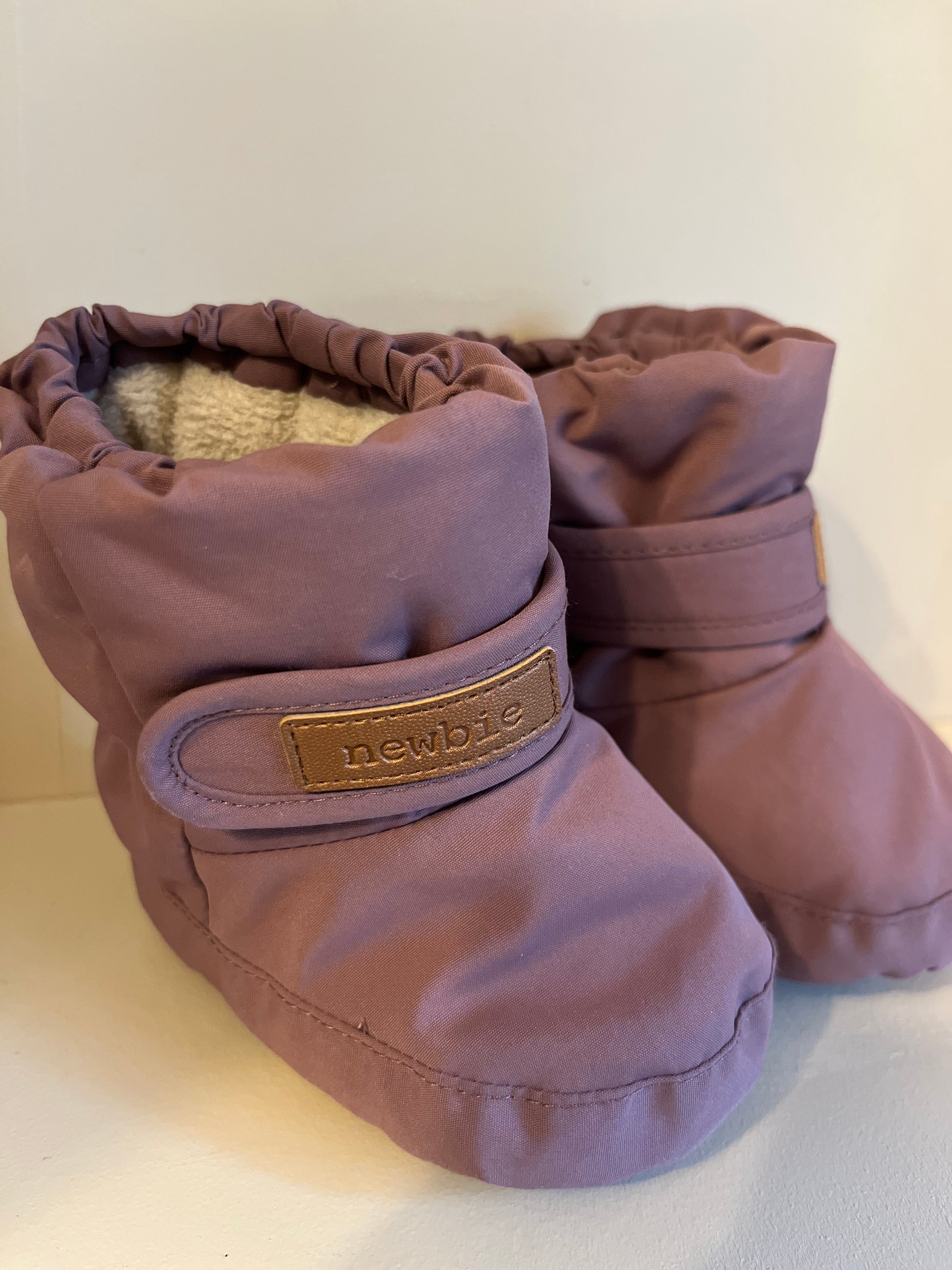 Varmfodrade tossor från Newbie, tillverkade i vattenavstötande material för att hålla små fötter torra. Utrustade med justerbar rem och resår både bak och upptill för en bekväm och säker passform. Mjukt fleecefoder och lätt vaddering på insidan ger extra värme under kyliga dagar. En praktisk och tidlös vinteraccessoar för de allra minsta.