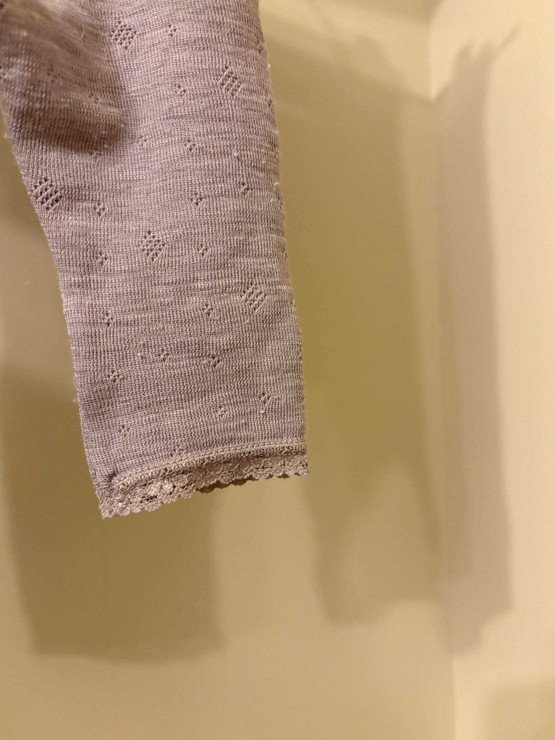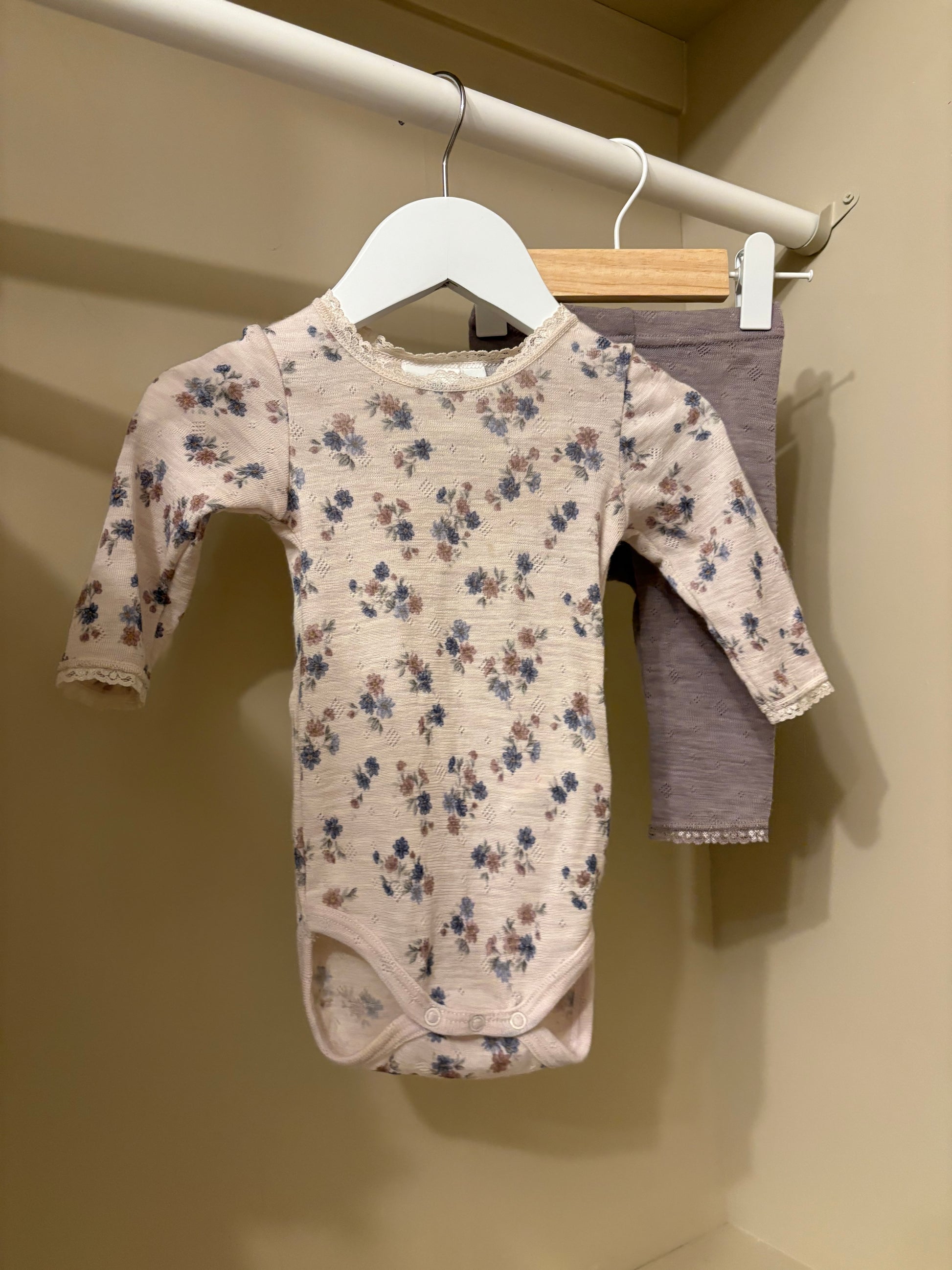 Setet består av matchande byxor med vacker spetskant samt en lila body prydd med blommor och spetsdetalj vid kragen. Ett mjukt och värmande set som kombinerar funktion med romantisk design lika fint till vardags som till speciella tillfällen.