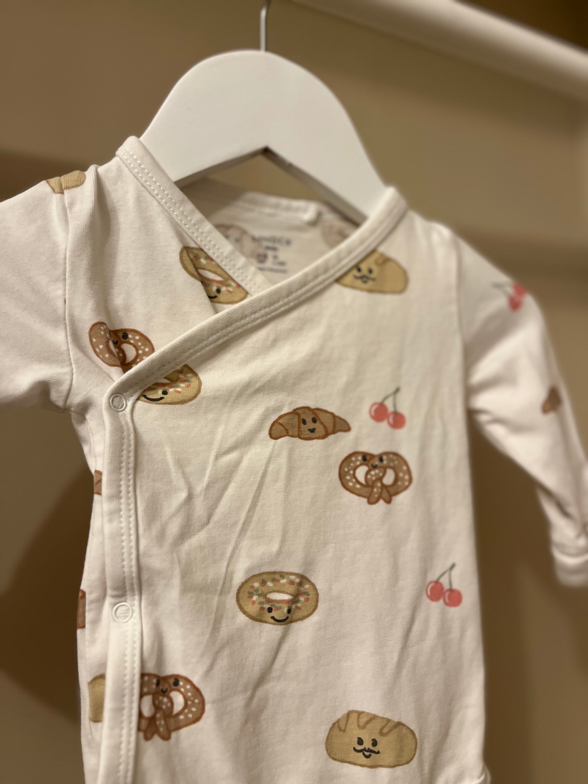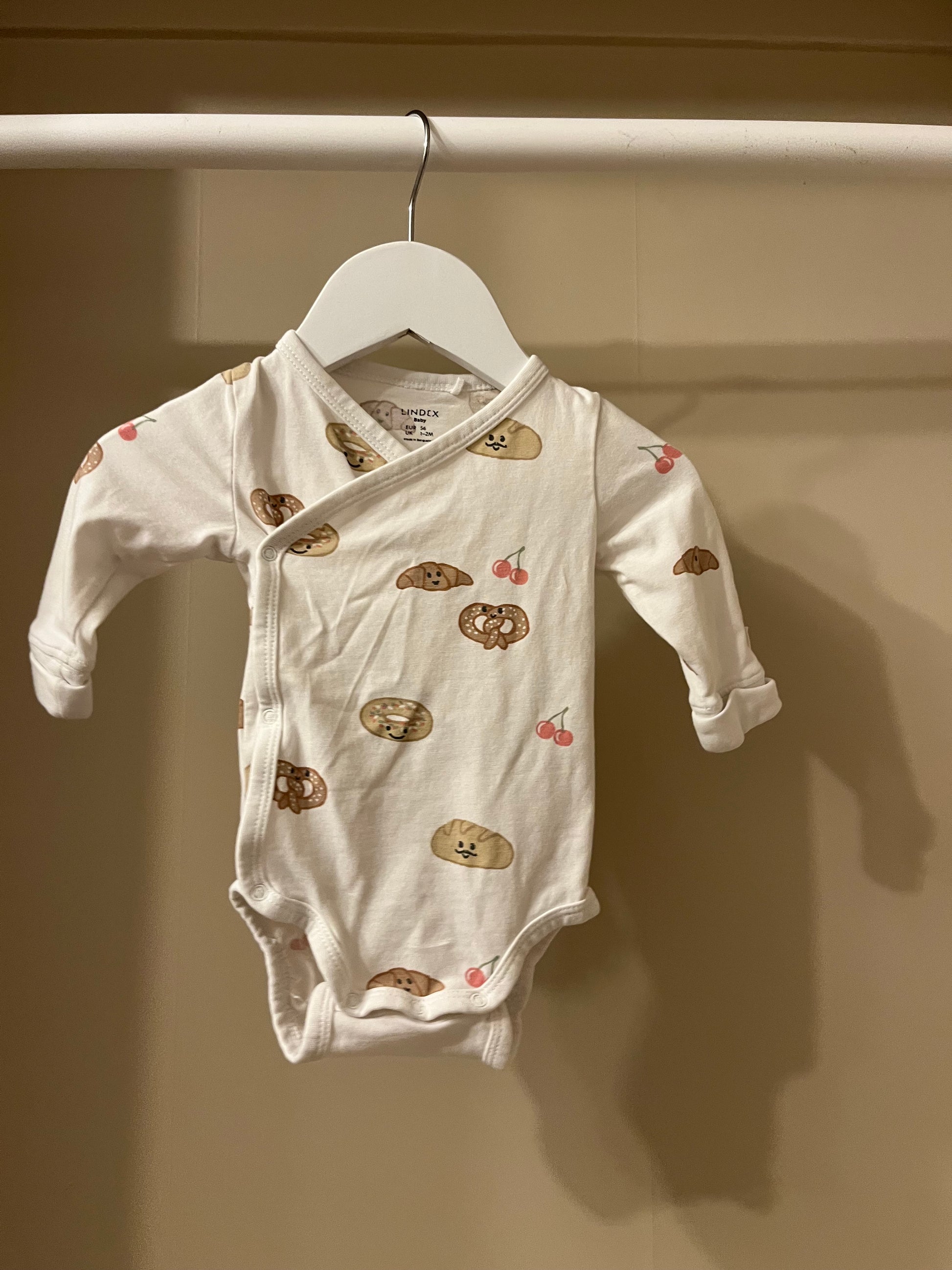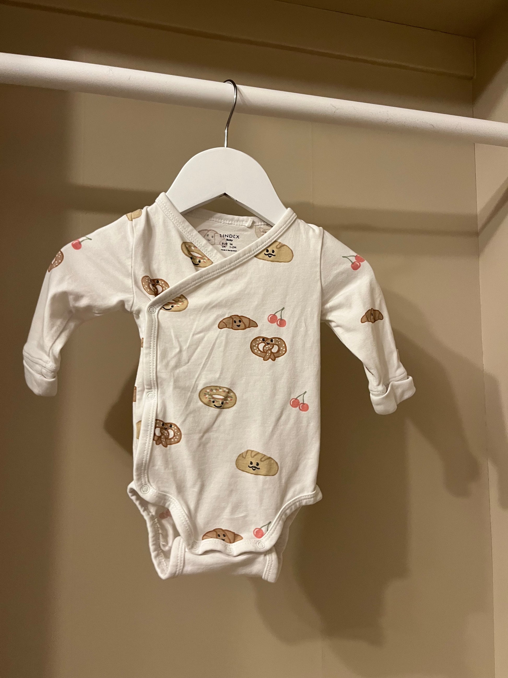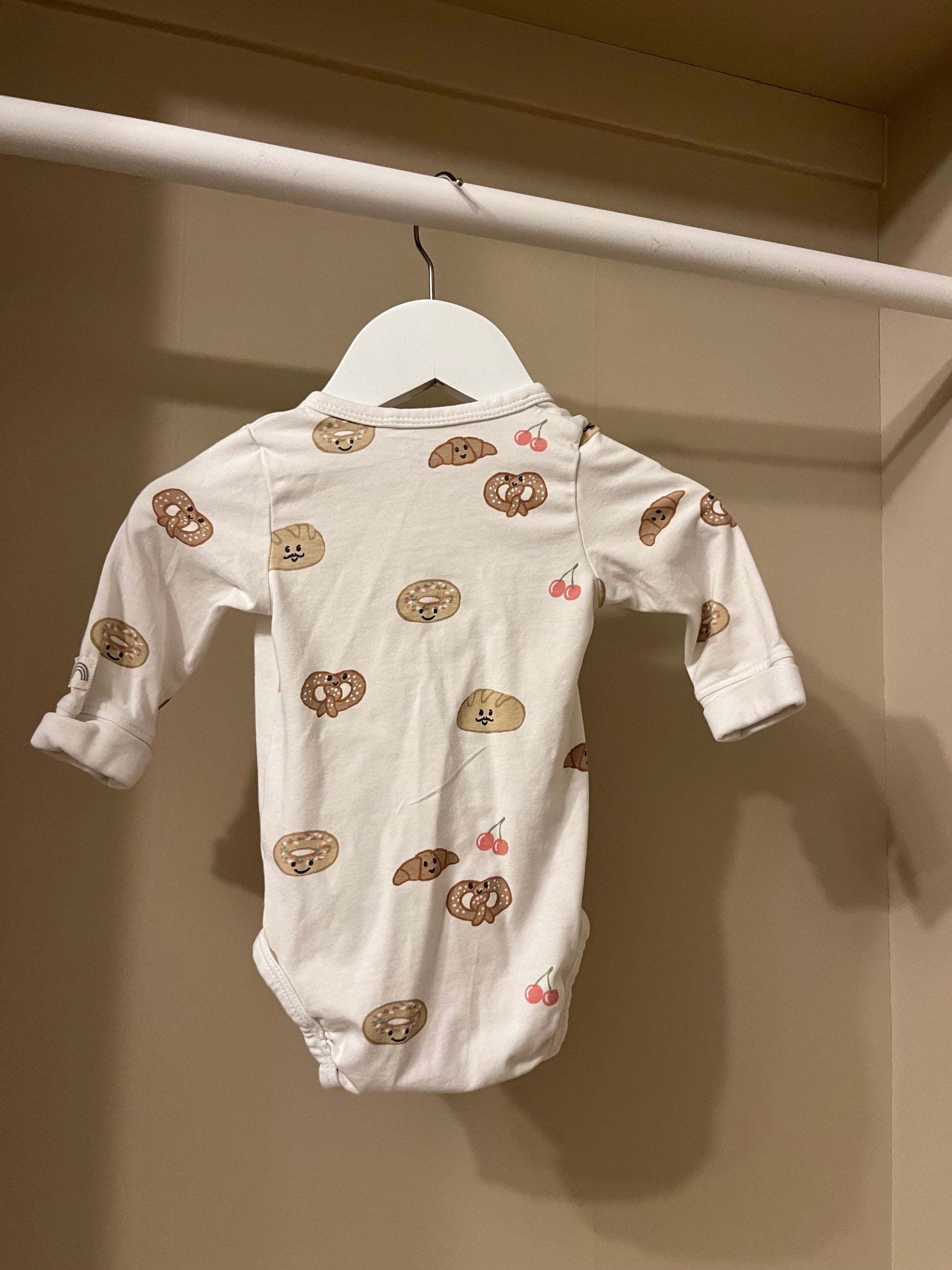 Gullig body med sött mönster av små bakverk. Smidig omlottknäppning framtill gör av- och påklädning enkel och skonsam för barnet. Förlängning i grenen ger längre användningstid – perfekt när barnet växer.